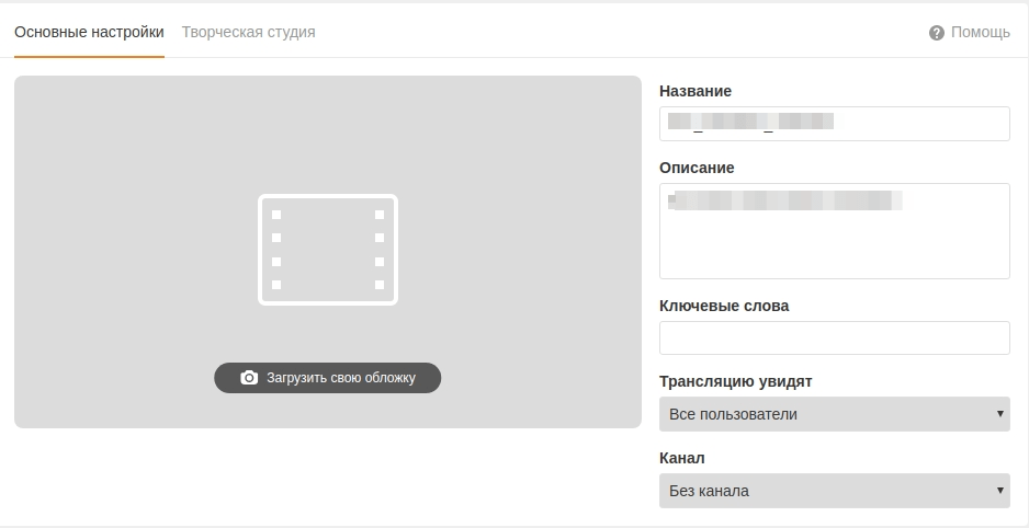 Откроется форма с параметрами создаваемой трансляции. Заполните требуемые поля.
