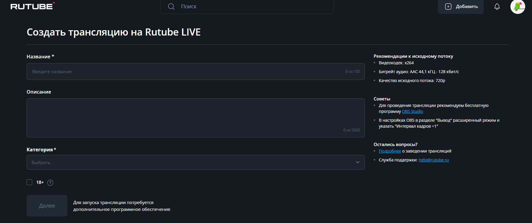 Откроется форма с параметрами создаваемой трансляции. Заполните требуемые поля и нажмите "Далее".